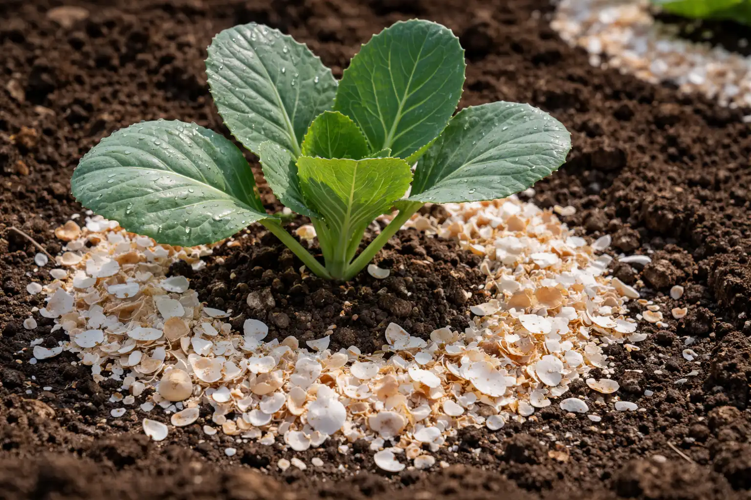 Zdrobljene lupine razporedite v tesnem obroču okoli stebla vsakega zelja.