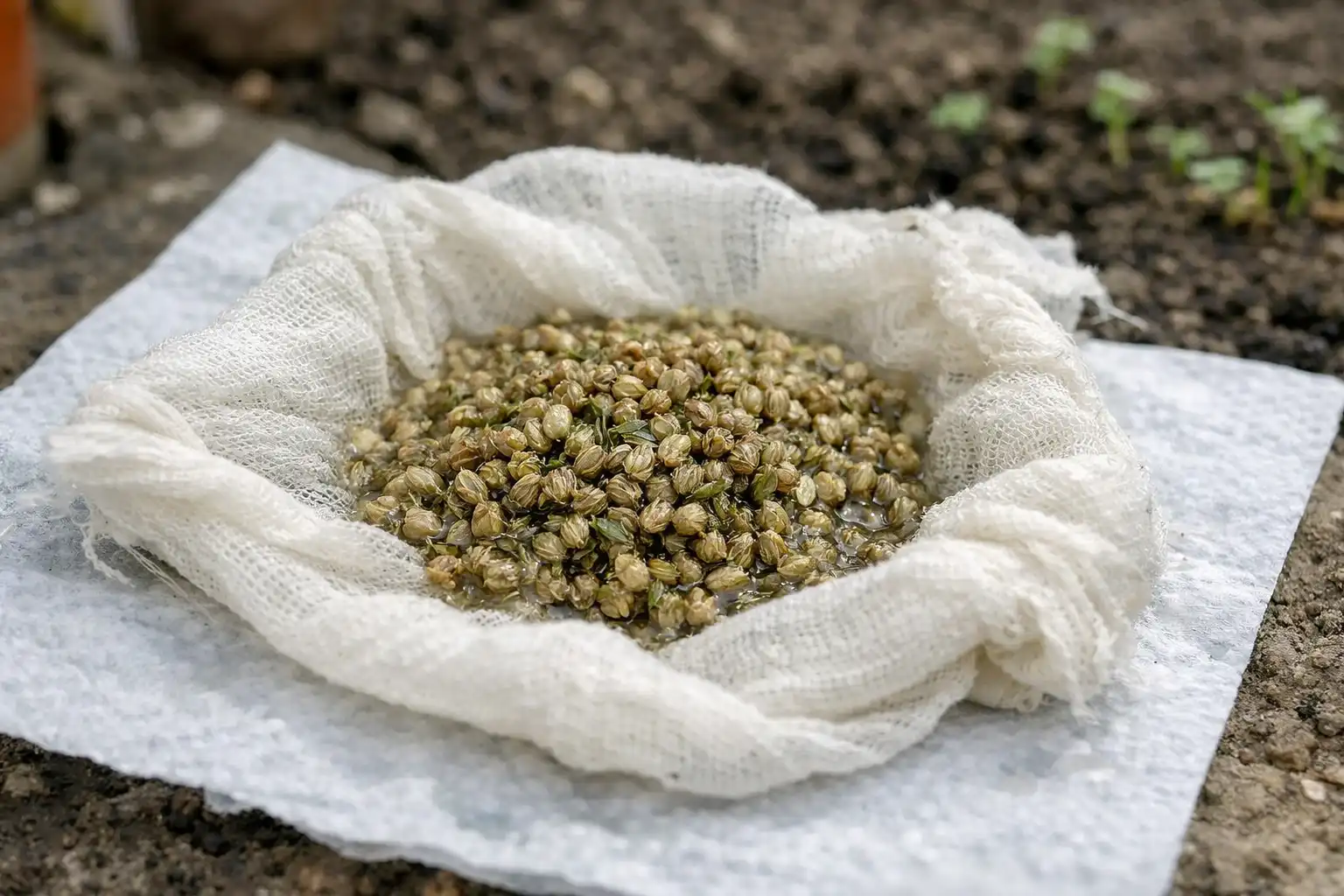 Za razbijanje oljne prevleke uporabljam navaden vodko ali vročo vodo (približno 50 stopinj Celzija). Semena dajte v vrečko iz gaze in jih za 15 minut potopite v tekočino. Nato jih obvezno sperite v hladni tekoči vodi. To bo spodbudilo energijo za kalitevin kalčki se bodo veliko močneje prebili skozi zemljo.