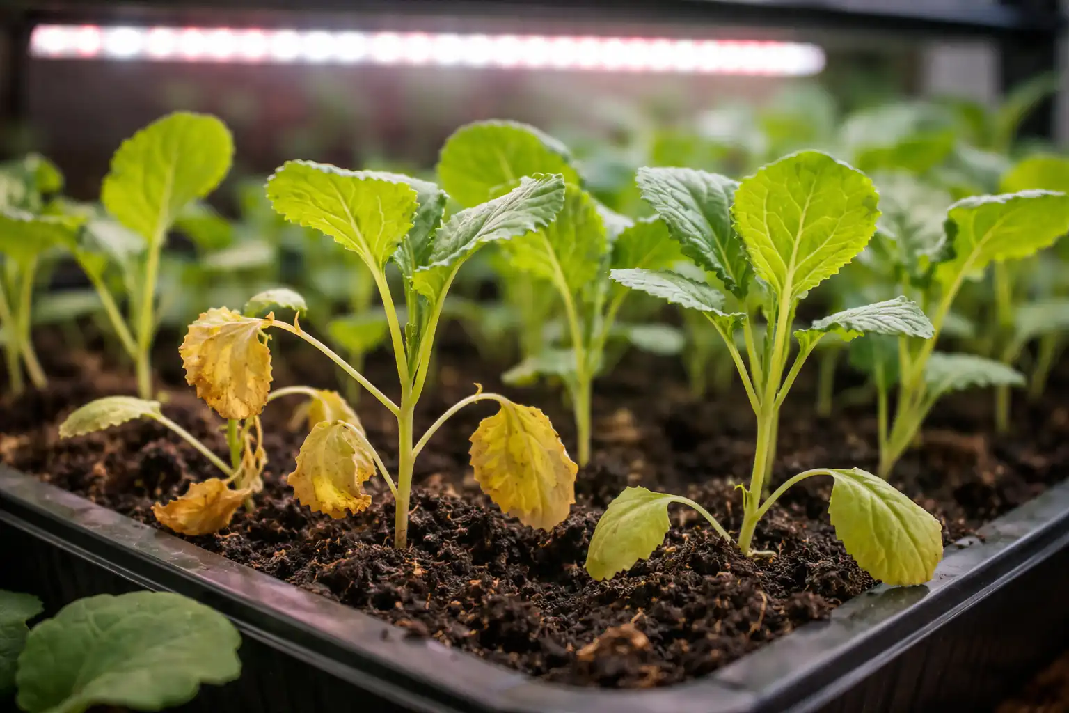 Mnogi vrtnarji se soočajo z dejstvom, da močni poganjki zelja nenadoma začnejo izgubljati turgor in se posušijo, čeprav so bili pravočasno zaliti. Glavni razlog je v kršitvi fotosinteza in izhlapevanje vlage, ko rastlini katastrofalno primanjkuje kakovostne svetlobe. Brez UV-svetlobe se steblo podaljša, postane krhko, koreninski sistem pa preneha oskrbovati liste s hrano.